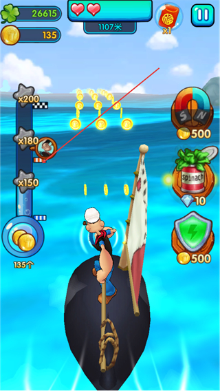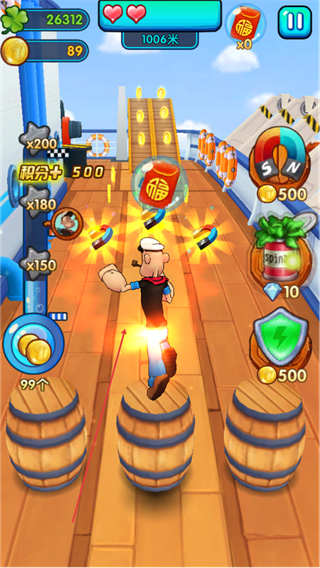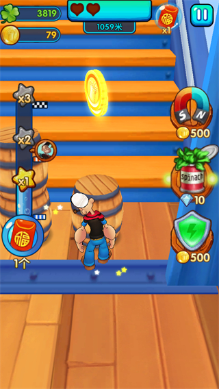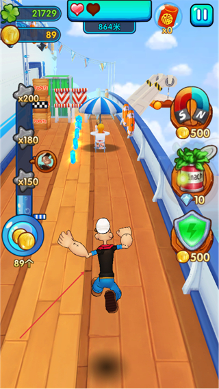 1、操控大力水手躲避障碍,沿赛道奔跑,收集道具,推进距离至864米。