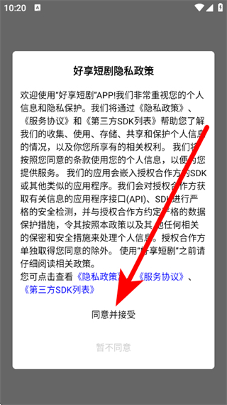 1、打开好享,在提示弹窗,点击同意并接受,进入登录页面。