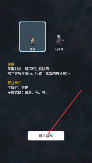 1、选择游侠职业,该职业掌握射术投掷和生存技巧,主属性为敏捷,专属武器是暗器弓弩,选好后点击进入游戏按钮开始游戏。