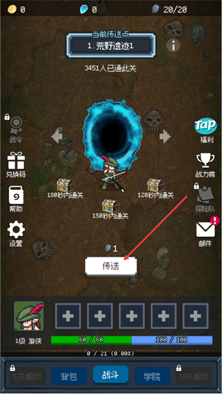 2、进入传送点界面当前传送点为荒野遗迹1,满足条件可领取通关宝箱,点击界面中的传送按钮进入对应关卡开始挑战。