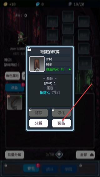 4、在背包中找到敏捷的皮裤,该护腿可增加敏捷属性,符合游侠主属性需求,点击界面中的装备按钮穿戴该装备,增强角色战力。
