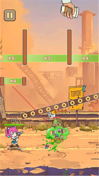 1、操控角色射击僵尸,借助轨道上的倍数加成如×5、×3提升伤害,击败僵尸积累资源。