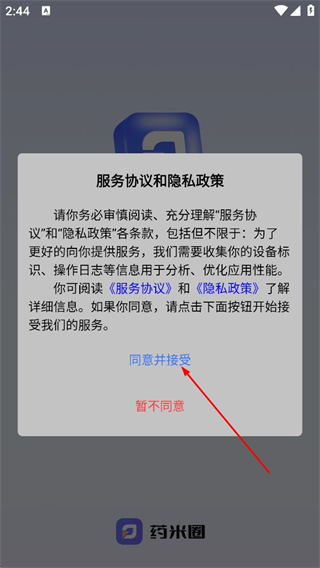 1、阅读服务协议和隐私政策后,点击同意并接受按钮。