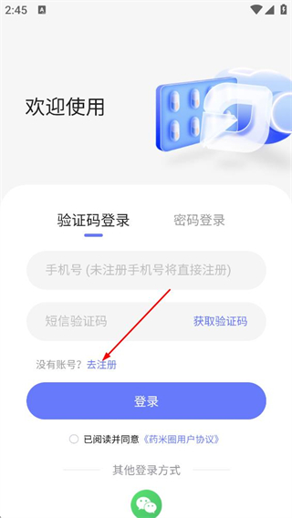 2、在欢迎使用页面,点击去注册选项,进入注册页面。