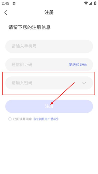4、在注册页面,填写请输入密码后,点击注册完成注册。
