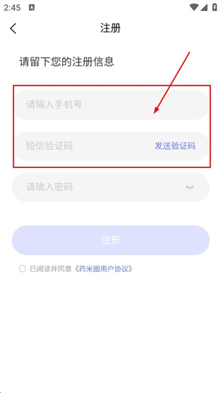 3、在注册页面,填写手机号,填写对应的短信验证码。