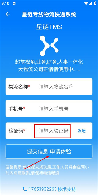 2、在体验申请页面填写物流名称和手机号后,点击发送按钮获取验证码。
