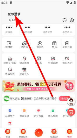 2、在个人页面,点击立即登录,进入花递的登录页面。