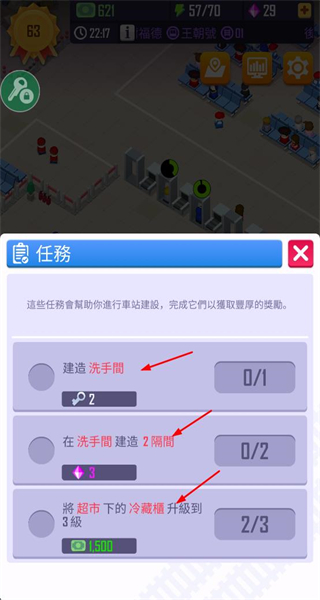 2、完成建造、升级类任务,解锁新设施,优化车站的运营配置。