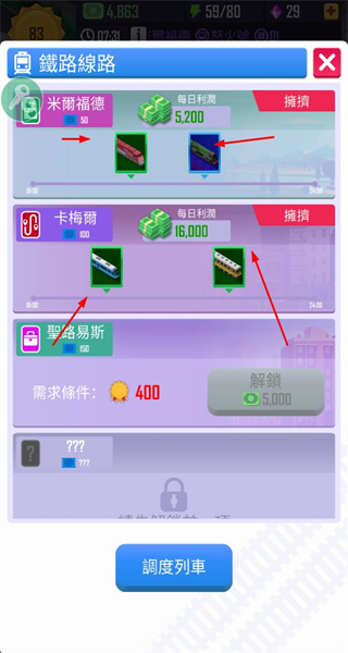 3、解锁铁路线路并调度列车,提升车站的客运效益,增加经营收益。