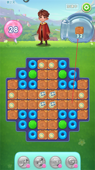 2、消除方块触发特效,获得积分,同时减少目标道具的剩余数量。