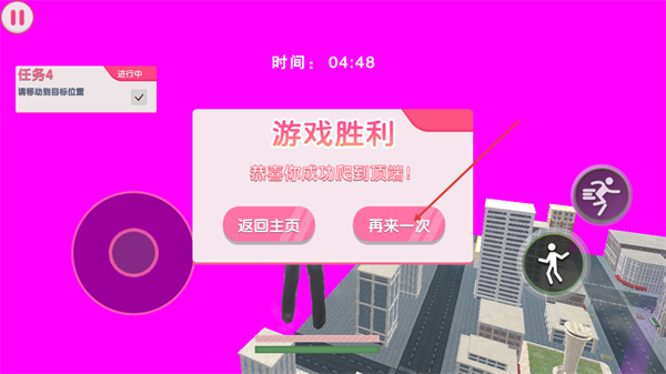 4、完成任务后出现游戏胜利提示,显示恭喜你成功爬到顶端,你可选择返回主页或再来一次来进行后续操作。