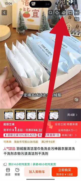 4、在商品详情页的右上角点击分享图标,弹出分享选项菜单。