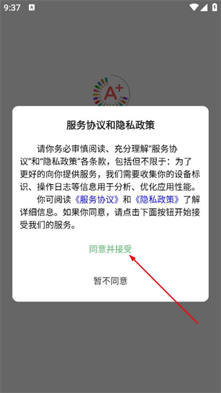 1、阅读服务协议和隐私政策后,点击同意并接受,进入首页。