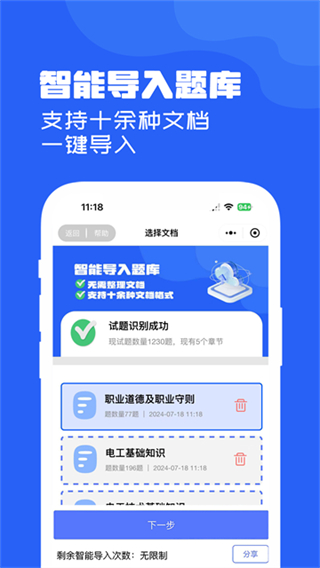 支持快速导入个人专属题库,格式兼容多种文档类型,上传后自动保存至云端,避免重复上传的繁琐操作,适配考生、职场学习者等各类用户的自定义练习需求。