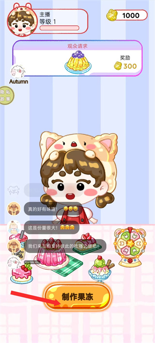 2、游戏中依照箭头指引,点击制作果冻按钮,响应观众的甜点请求,朝着完成直播任务的目标前进。