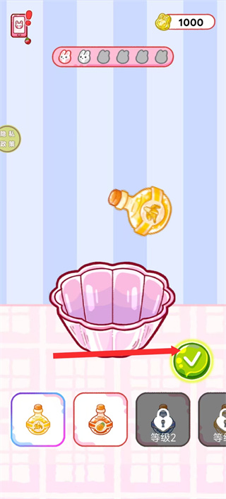 3、紧跟红色箭头指引,点击右侧的对钩的按钮,确认添加对应的果冻原料,推进甜点的制作流程。