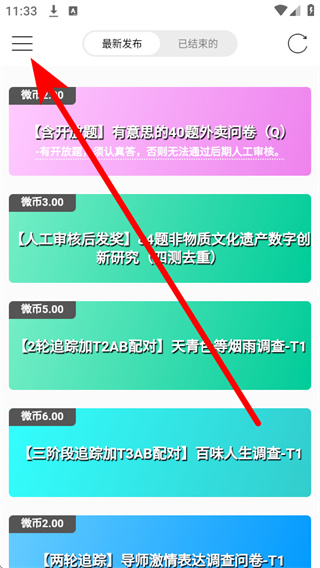 1、打开微调查,点击页面左上角的菜单,展开侧边栏菜单。