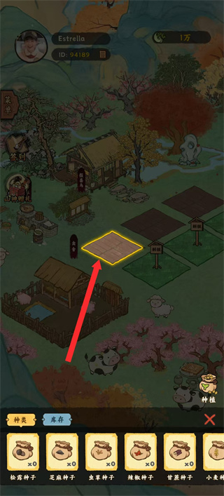 1、进入游戏主界面后,先点击箭头指向的空地区域,打开下方的功能栏,这是开启农场操作的第一步。