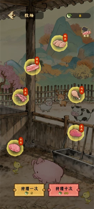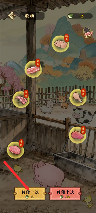 2、在功能栏中选择符猎相关选项,进入牧场场景后,点击箭头指向的符猎一次按钮,消耗对应的货币进行狩猎,获取肉类食材。