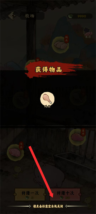 3、狩猎完成后,会弹出获得物品的提示比如获得鸡腿,此时点击任意空白处关闭提示框,就能回到牧场界面继续操作。