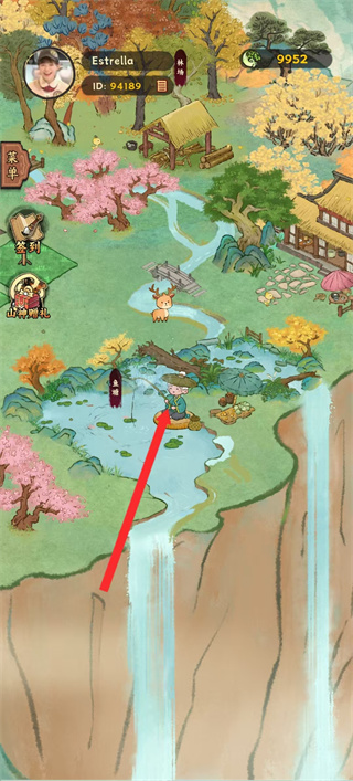4、完成牧场的狩猎操作后,返回主场景,跟随箭头指引进入池塘区域,可解锁钓鱼等新的资源获取玩法,拓展农场的经营内容。