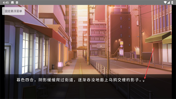 2、查看当前场景的文字提示暮色四合,阴影缓缓爬过街道,逐渐吞没地面上乌鸦交缠的影子,点击对话框推进游戏剧情。