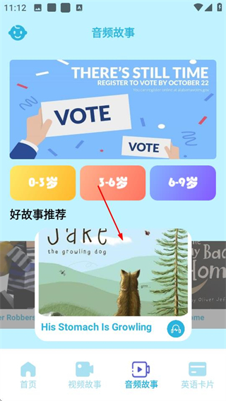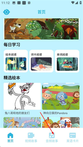 1、进入首页后,点击底部的音频故事选项,可进入音频故事页面。