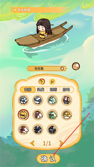 1、在宗主样貌界面,角色名为司空翼,选择衣服等外观选项后,点击下方的确认按钮,即可保存当前设置的宗主外观。