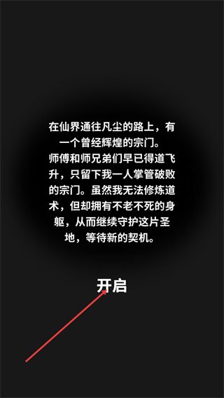 2、阅读这段宗门背景剧情后,点击界面中的开启按钮,就能正式进入游戏,开启对这片破败宗门的管理与守护之旅。