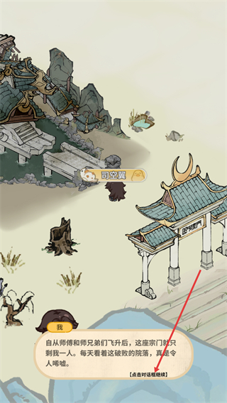 3、处于宗门场景的对话界面,看到司空翼的互动内容后,点击对话框继续,推进剧情了解宗门当前的具体状况。