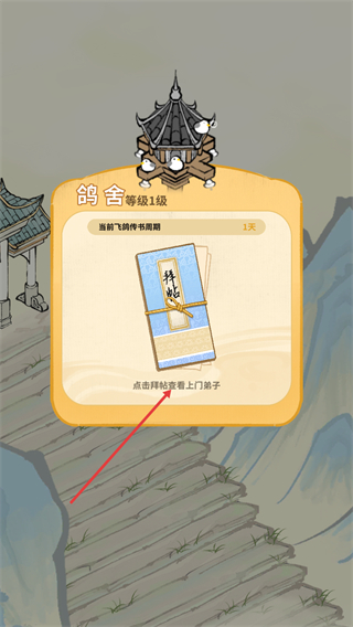 4、进入鸽舍界面,该建筑当前等级1级,飞鸽传书周期为1天,点击界面中的拜帖即可查看上门弟子,这是获取弟子的关键操作。