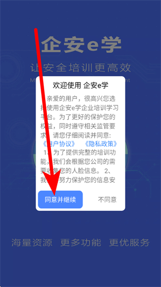 1、打开企安e学,在弹窗点击同意并继续,进入登录页面。