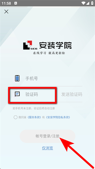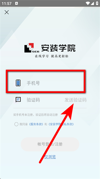 3、在登录注册界面,输入手机号,点击发送验证码。