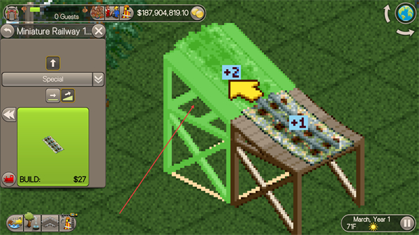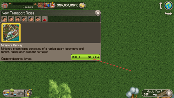 1、在NewTransportRides界面选择MiniatureRailway,点击BUILD花费$1300+建造该设施。