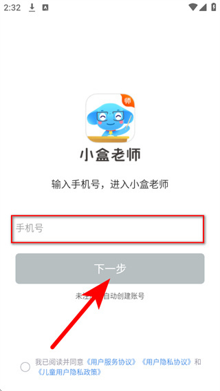 2、在该页面的手机号框填写手机号,勾选协议,点击下一步。