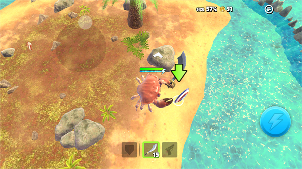 2、持续攻击小生物,积累数值,让螃蟹体型逐步变大,增强战斗力。