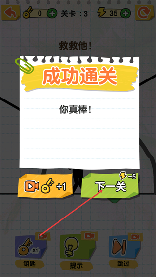 4、完成遮挡画线后界面显示成功通关及你真棒的弹窗,消耗5体力点击下一关按钮可进入后续关卡。