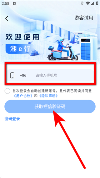 3、在登录界面,输入手机号,点击获取短信验证码。