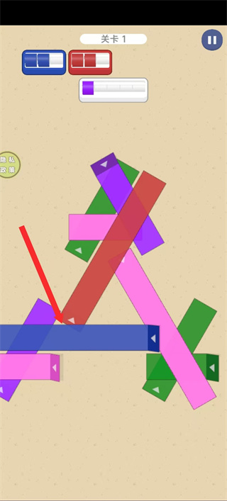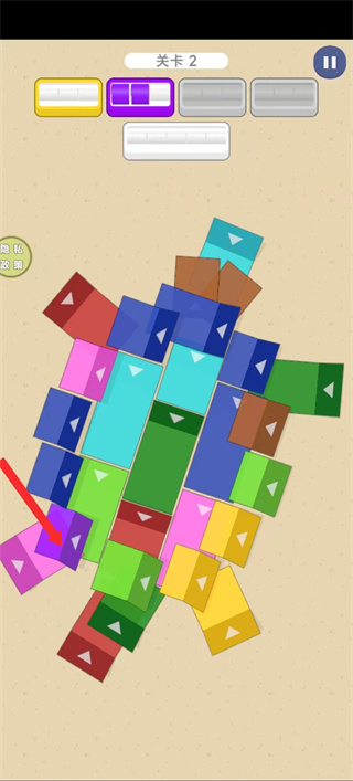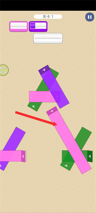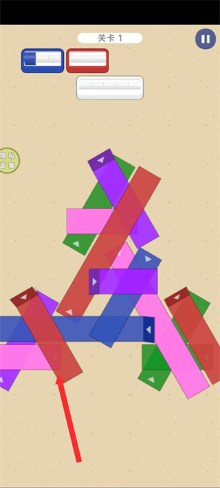 1、进入关卡后,点击带箭头的方块如红色方块,方块会沿箭头方向移动,以此调整方块位置。