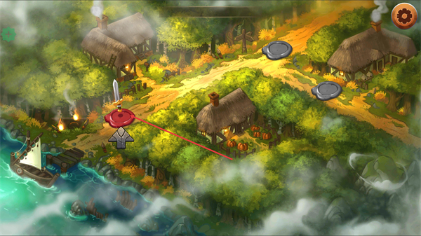 2、在村落地图界面找到带剑图标的红色印章关卡,点击它可触发对应剧情或任务,推进游戏流程进入后续互动环节。