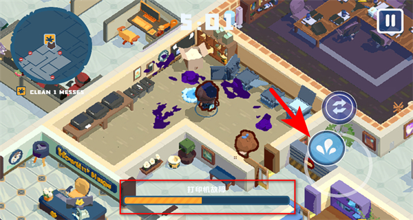 3、在清洁场景中,点击清洁按钮,对污渍区域进行清理操作,完成目标。