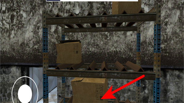 4、移动到货架旁,点击箭头指向的纸箱,触发打开纸箱,获取隐藏道具或线索,推进游戏探索。