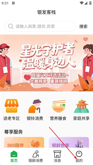 1、在银发客栈首页,点击底部的我的选项,进入登录选择页面。