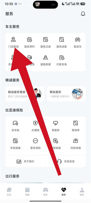 3、在服务页面的车主服务板块中,点击门店查询,进入售后门店页面。