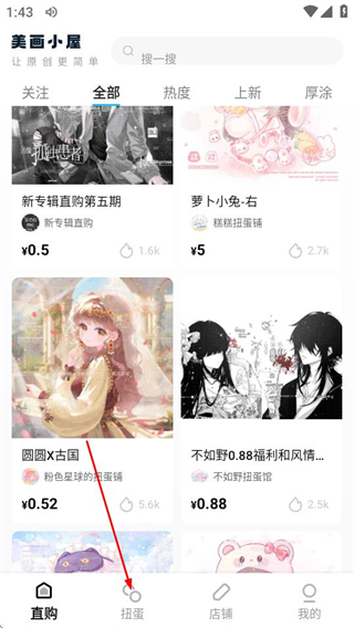 1、进入美画小屋后,点击底部的扭蛋选项,可进入扭蛋页面。