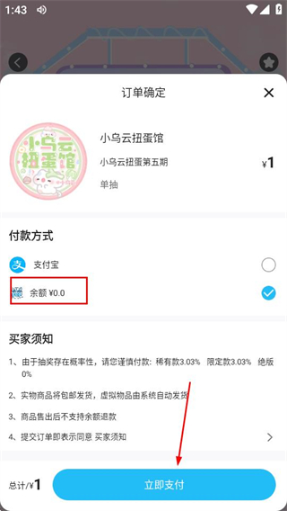 4、在订单确定页面,选择付款方式后完成支付流程,即可扭蛋。