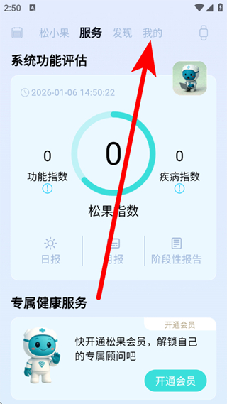 1、在松果健康首页,点击顶部我的,进入个人页面。