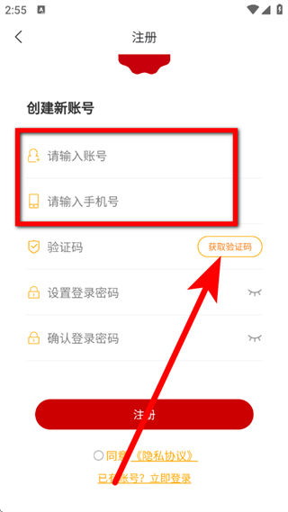 2、在登录页面,点击注册账号,进入创建新账号的注册页面。