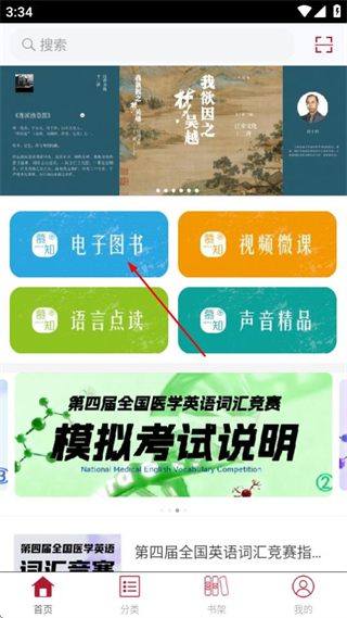 1、进入首页后,点击电子图书选项,可进入电子图书分类页面。